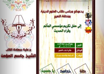 برعاية سعادة النائب الشيخ جاسم المؤمن يدعوكم مجلس طلاب العلوم الدينية بمنطقة النعيم إلى حفل تكريم مؤسسي المآتم وقراء الحديث