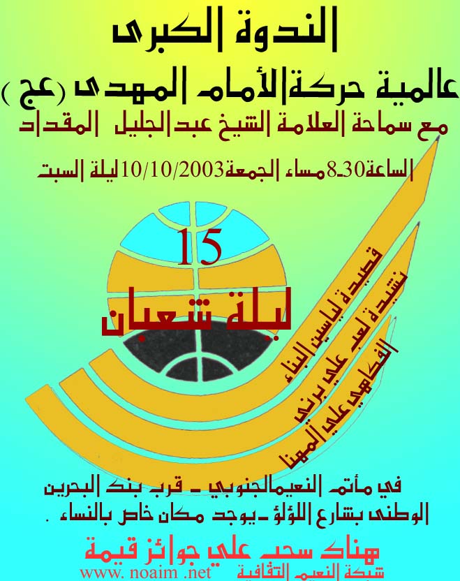 يدعوكم مأتم النعيم الجنوبي لحضور الاحتفال المركزي بمولد منقذ البشرية الإمام المهدي(عج) وذلك مساء الجمعة (ليلة السبت) 10/10/2003م الساعة الثامنة والنصف مساءا.