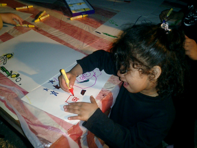 لأول مرة تشاركنا الفنانة العراقية الأستاذه جنان الموسوي حيث أشرفت على الفعالية وقامت بدور كبير في توجيه البنات وإرشادهم وتقول أن كل طفل هنا يعبر بطريقته الخاصة والأهم أن يعبر عن صورة رآها أو يتخيلها وبصورة عفوية . وتقول بأن جرأة البنات زادت مع زيادة عدد الأطفال الآخرين .