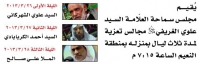 يقيم مجلس العلامة السيد علوي الغريفي مجلس تعزية لمدة ثلاث ليال بمنزلة بمنطقة النعيم 7:15م
