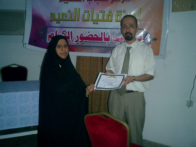 وختاماً تسلم الدكتور وليد شهادة شكر وتقدير على تلبيته الدعوة وإلقائه المحاضرة القيمة، من رئيسة لجنة فتات النعيم.