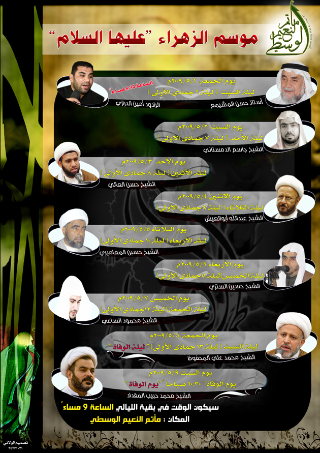 بمشاركة المشيمع والمحفوظ والمقداد والعالي و .. في موسم الزهراء .. مأتم النعيم الوسطي