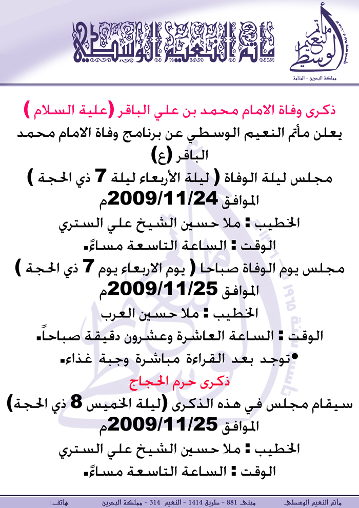 ذكرى وفاة الإمام محمد بن علي الباقر(ع) و حـــرم الـحـجــاج .. مـــأتـم الــنـعـيـم الــوسـطـــي
